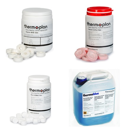 Damit Ihre Thermoplan Kaffeemaschine immer hygienisch einwandfrei funktioniert und der Kaffeegeschmack hervorragend bleibt, ist der Einsatz von speziellen Reinigungsmitteln wichtig. Diese Reinigungsmittel sind speziell auf das automatische Reinigungsprogramm der Black&White Kaffeevollautomaten konzipiert und abgestimmt. Je nach Modell werden Reinigungstabletten (Milk Tabs, Coffee Tabs) oder Flüssigreiniger (Thermoblue, Thermored) benötigt. Alle Mittel bekommen Sie direkt von uns oder können diese auch in unserem Onlineshop bestellen. Wir versenden nach ganz Deutschland und Europa.